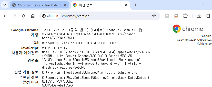 이때 chrome 주소창에 chrome://version을 입력하면 프로필이 어디에 있는지 확인할 수 있다.